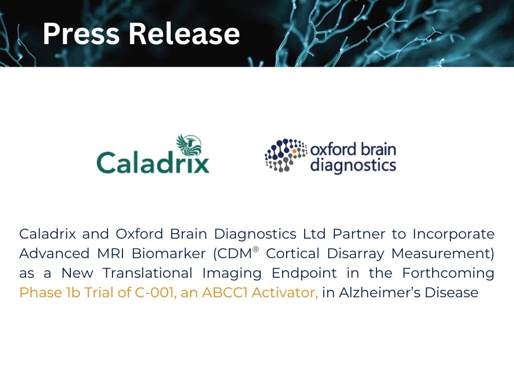 Caladrix and Oxford Brain Diagnostics Ltd Partner to Incorporate Advanced MRI Biomarker (CDM® Cortical Disarray Measurement) as a New Translational Imaging Endpoint in the Forthcoming Phase 1b Trial of C-001, an ABCC1 Activator, in Alzheimer’s Disease. Collaboration integrates next-generation diffusion MRI biomarkers to visualize cortical microstructure and quantify neuroinflammation and neuronal disorganization in vivo. CDM® was granted FDA breakthrough device designation and CDM Insights is FDA 510(k)-cleared. This pioneering imaging biomarker—enables quantitative insight into how ABCC1 activation modulates glial and neuroinflammatory pathways. Integration of CDM® enhances Caladrix’s multidimensional assessment of disease modification in early Alzheimer’s, uniting molecular, fluid, and structural biomarkers